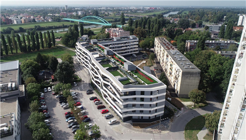 U Veslačkoj ulici u Zagrebu projektirana je zgrada koju je projektirao Luka Korlaet. Zgrada ima 5 etaža i ravni krov koji se koristi kao zajednički prostor za stanare – primjerice za boravak, vrt ili druge aktivnosti.