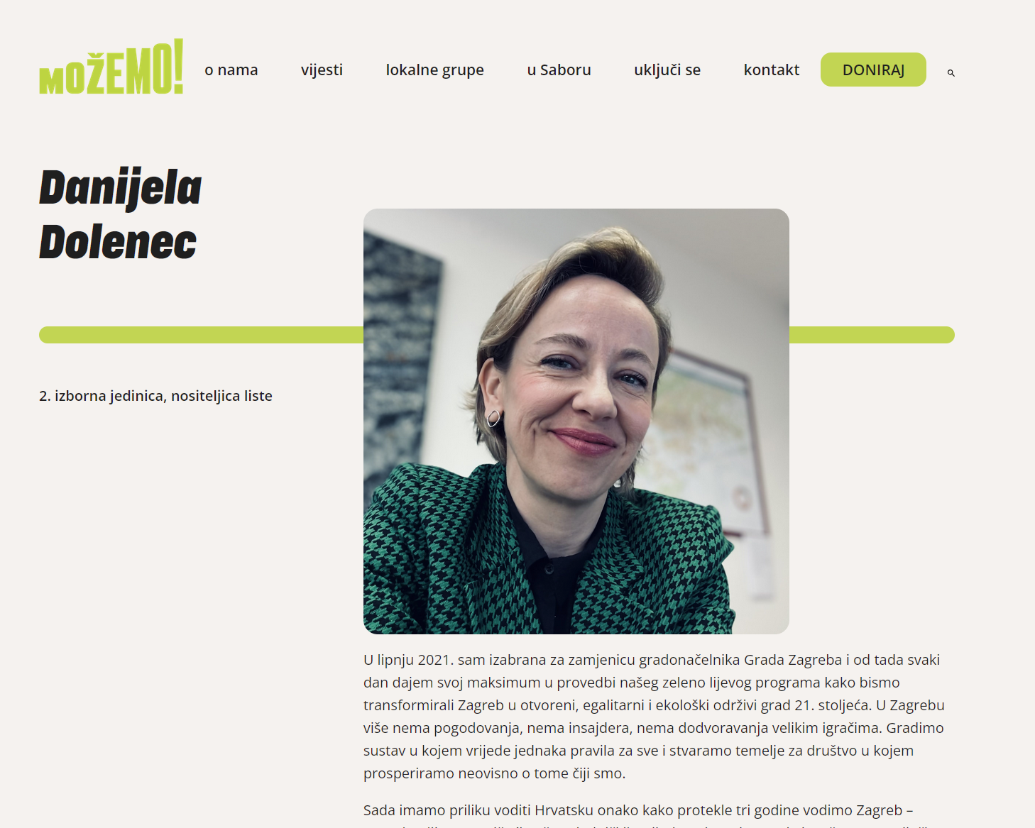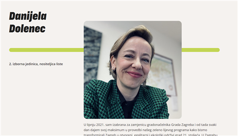 2. izborna jedinica, nositeljica liste U lipnju 2021. sam izabrana za zamjenicu gradonačelnika Grada Zagreba i od tada svaki dan dajem svoj maksimum u provedbi našeg zeleno lijevog programa kako ... Danijela Dolenec